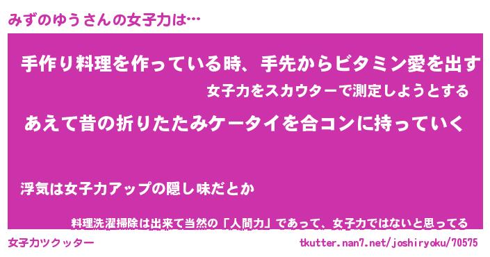 | ファンタジー風あだ名 | 『ミズフェル』『エターナルミズノユウー』 |