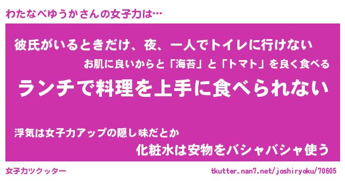 | 恥ずかしいあだ名 | 『プリティーわたなべゆうか』『わたちん』 |