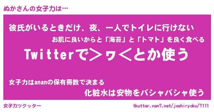 | 女子向けラノベタイトル風あだ名 | 『ぬか姫と円卓の騎士』『死神ぬかの再婚』 |
