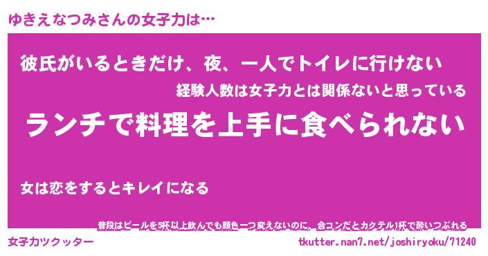 | 恥ずかしいあだ名 | 『プリティーゆきえなつみ』『ゆきっちょ』 |