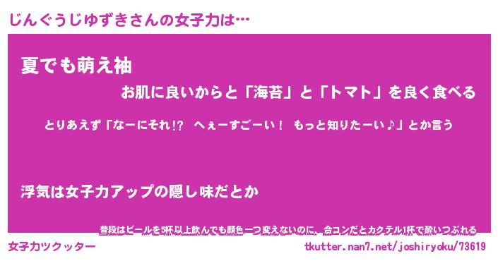 | 女子向けラノベタイトル風あだ名 | 『じんぐうじゆずき姫と円卓の騎士』 |