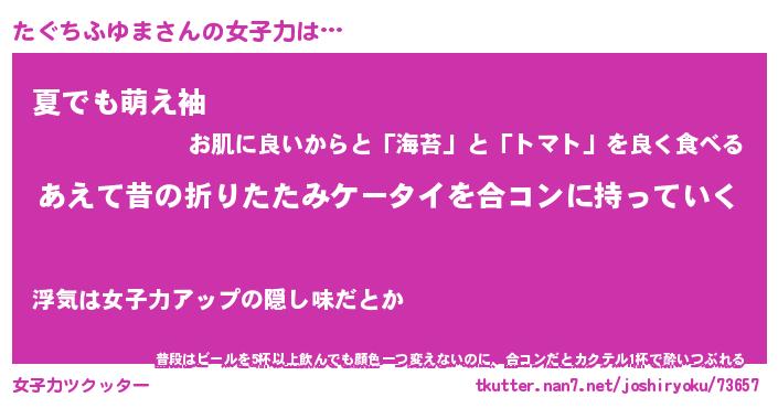| 恥ずかしいあだ名 | 『プリティーたぐちふゆま』『たぐっちょ』 |