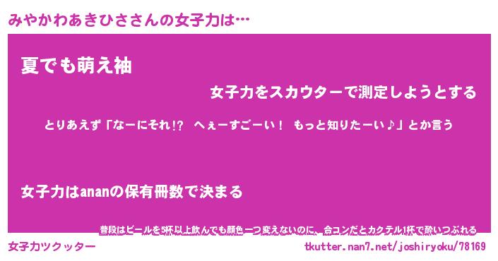 | ヘコむあだ名 | 『みやにー』『つくし』『みや太郎』 |