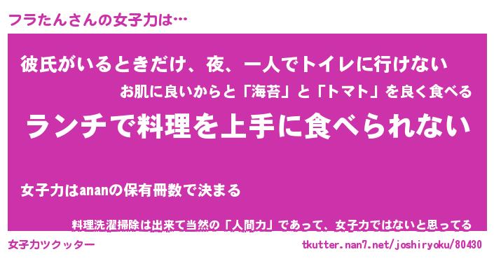 | 意味不明あだ名 | 『ペロリンフラたん』『永久保存フラたん』 |