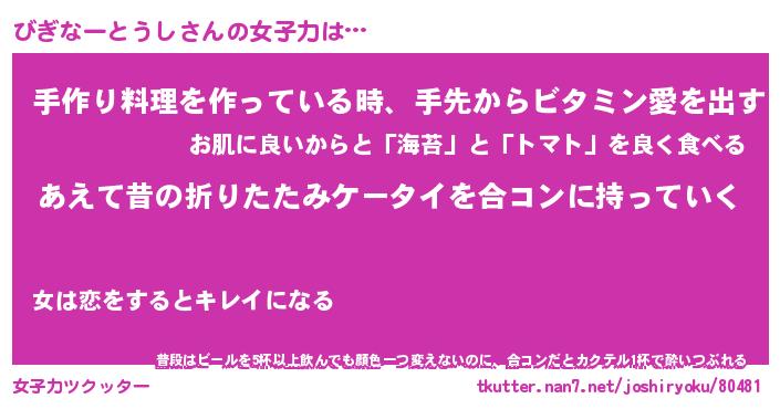 | ヘコむあだ名 | 『びぎもー』『つくし』『びぎお』 |