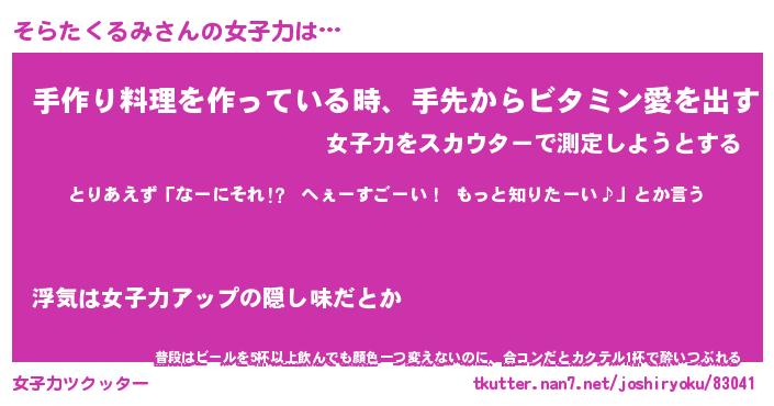 | 恥ずかしいあだ名 | 『プリティーそらたくるみ』『そらっちょ』 |