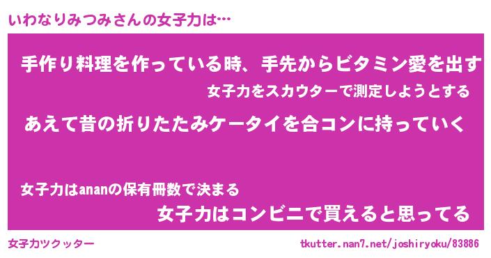 | 恥ずかしいあだ名 | 『プリティーいわなりみつみ』『いわちん』 |