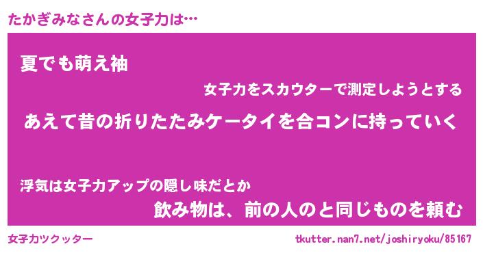 | 恥ずかしいあだ名 | 『プリティーたかぎみな』『たかっちょ』 |