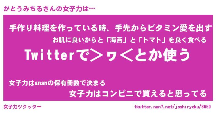 | 恥ずかしいあだ名 | 『プリティーかとうみちる』『かとっちょ』 |