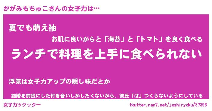 | 料理風あだ名 | 『ネギたっぷりかがみもちゅこの南蛮漬け』 |