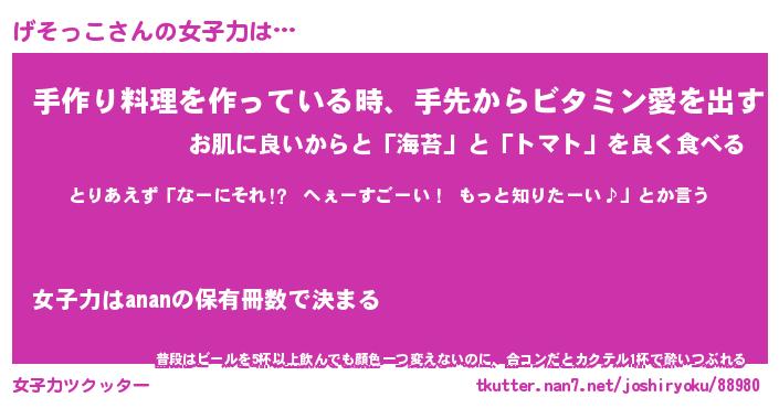 | ヘコむあだ名 | 『げそにゅー』『つくし』『げそを』 |