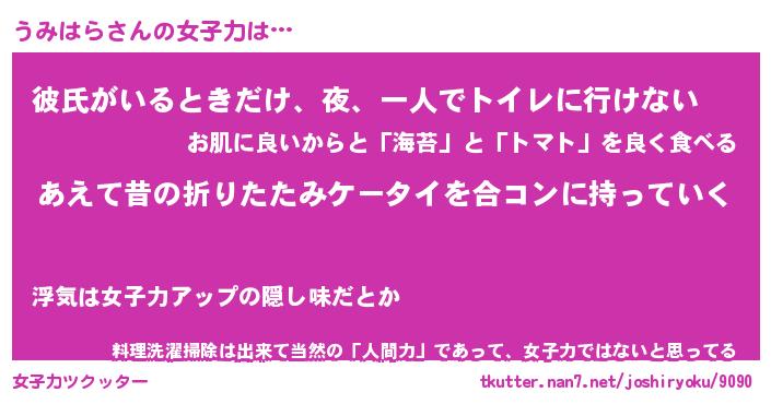 | ヘコむあだ名 | 『うみふぇ~』『牛乳』『うみぷりん』 |