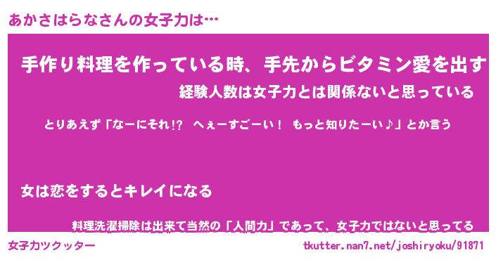 | 恥ずかしいあだ名 | 『プリティーあかさはらな』『あかっちょ』 |
