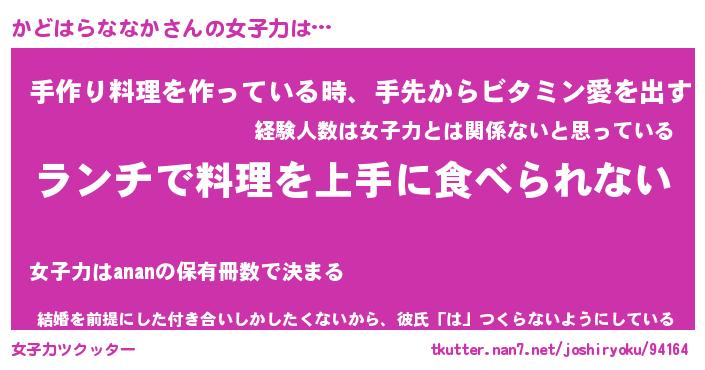 | 恥ずかしいあだ名 | 『プリティーかどはらななか』『かどちん』 |