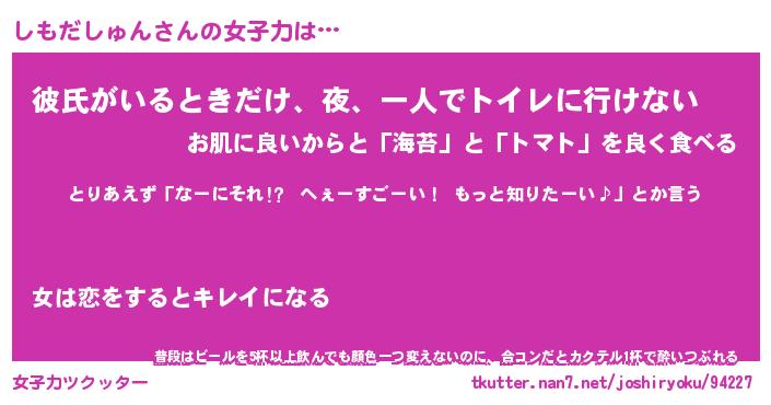 | 恥ずかしいあだ名 | 『プリティーしもだしゅん』『しもっちょ』 |