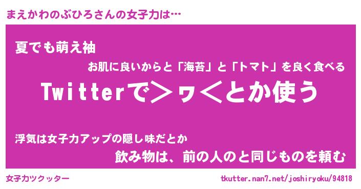 | 男性向けラノベタイトル風あだ名 | 『まえかわのぶひろの憂鬱』 |