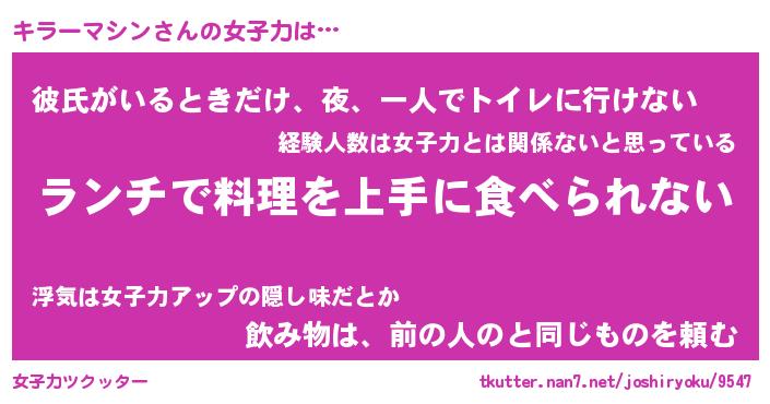 | ヘコむあだ名 | 『キラにー』『なまこ酢』『キラ太郎』 |