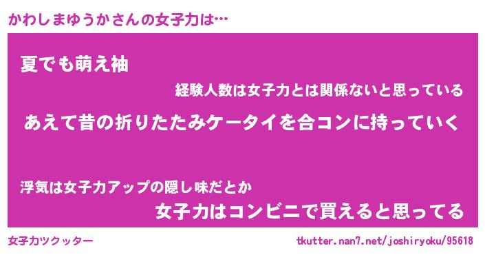 | 恥ずかしいあだ名 | 『プリティーかわしまゆうか』『かわちん』 |