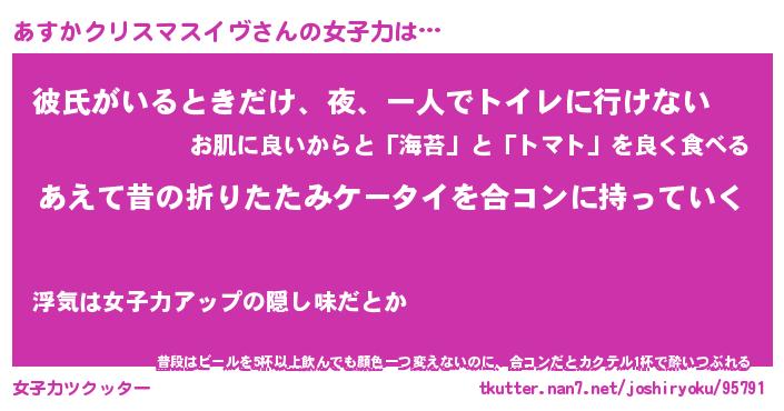 | 男性向けラノベタイトル風あだ名 | 『あすかクリスマスイヴの憂鬱』 |