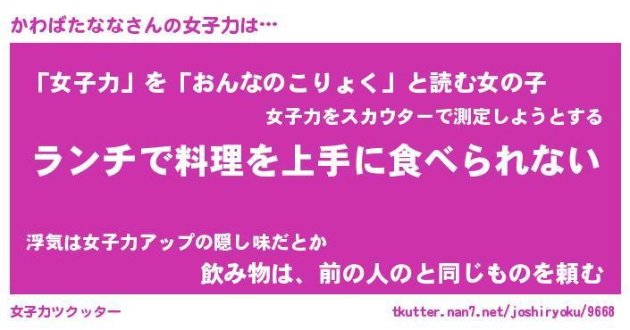 | 恥ずかしいあだ名 | 『プリティーかわばたなな』『かわっちょ』 |