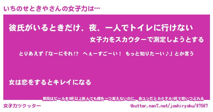 | 恥ずかしいあだ名 | 『プリティーいちのせときや』『いちちん』 |