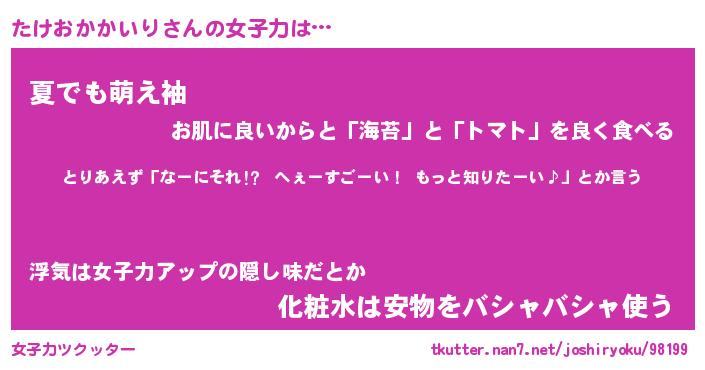 | ヘコむあだ名 | 『たけにー』『レバニラ』『たけっぺ』 |