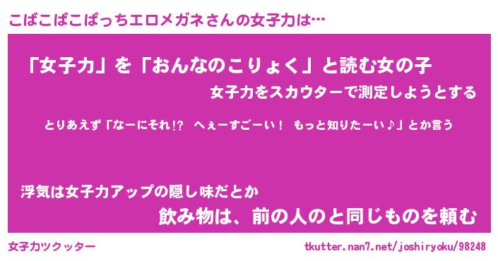 | 女子向けラノベタイトル風あだ名 | 『こばこばこばっちエロメガネ姫と円卓の騎士』 |