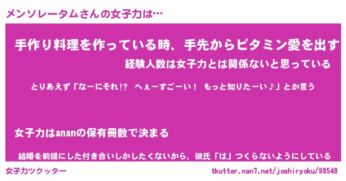 | ヘコむあだ名 | 『メンふぇ~』『なまこ酢』『メンお』 |