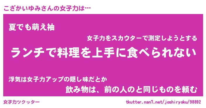 | 恥ずかしいあだ名 | 『プリティーこざかいゆみ』『こざっちょ』 |