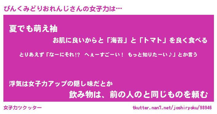 | 料理風あだ名 | 『ネギたっぷりぴんくみどりおれんじの南蛮漬け』 |