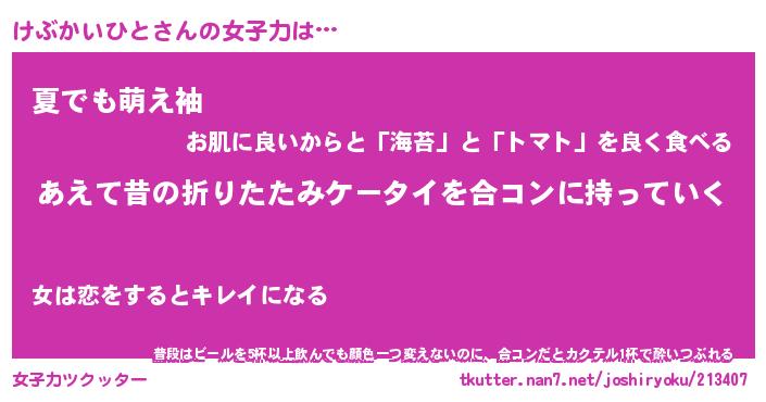 | ヘコむあだ名 | 『けぶふぇ~』『なまこ酢』『けぶお』 |