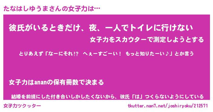 | 女子向けラノベタイトル風あだ名 | 『たなはしゆうま姫と円卓の騎士』 |