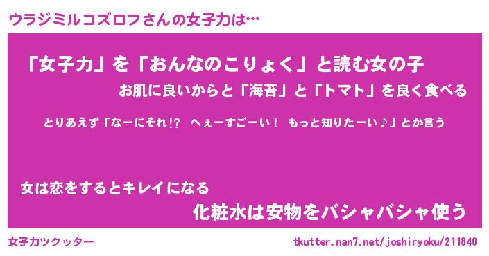| 女子向けラノベタイトル風あだ名 | 『ウラジミルコズロフ姫と円卓の騎士』 |