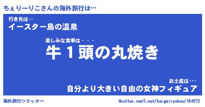 ちぇりーりこさんの海外旅行は… 楽しみな食事は・・・『牛1頭の丸焼き』行き先は…『イースター島の温泉』お土産は・・・『自分より大きい自由の女神フィギュア』 ツクッター #海外旅行ツクッター http://tkutter.nan7.net/kaigairyokou/104072/