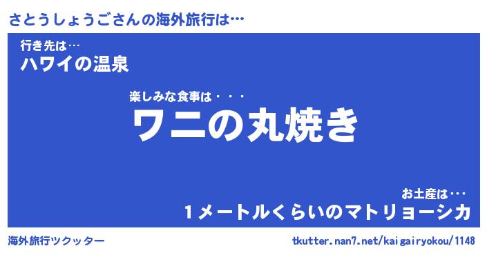 さとうしょうごさんの海外旅行は… 楽しみな食事は・・・『ワニの丸焼き』行き先は…『ハワイの温泉』お土産は・・・『1メートルくらいのマトリョーシカ』 ツクッター #海外旅行ツクッター http://tkutter.nan7.net/kaigairyokou/1148/