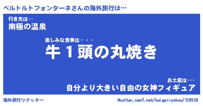 ベルトルトフォンターネさんの海外旅行は… 楽しみな食事は・・・『牛1頭の丸焼き』行き先は…『南極の温泉』お土産は・・・『自分より大きい自由の女神フィギュア』 ツクッター #海外旅行ツクッター http://tkutter.nan7.net/kaigairyokou/128538/