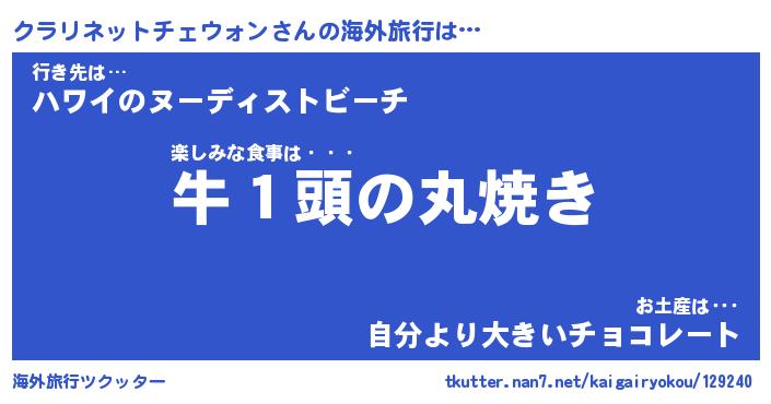 クラリネットチェウォンさんの海外旅行は… 楽しみな食事は・・・『牛1頭の丸焼き』行き先は…『ハワイのヌーディストビーチ』お土産は・・・『自分より大きいチョコレート』 ツクッター #海外旅行ツクッター http://tkutter.nan7.net/kaigairyokou/129240/