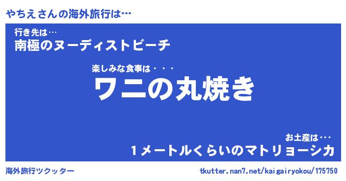 やちえさんの海外旅行は… 楽しみな食事は・・・『ワニの丸焼き』行き先は…『南極のヌーディストビーチ』お土産は・・・『1メートルくらいのマトリョーシカ』 ツクッター #海外旅行ツクッター http://tkutter.nan7.net/kaigairyokou/175750/