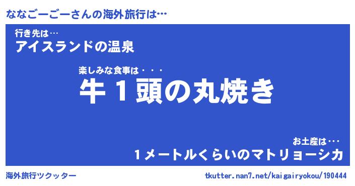 ななごーごーさんの海外旅行は… 楽しみな食事は・・・『牛1頭の丸焼き』行き先は…『アイスランドの温泉』お土産は・・・『1メートルくらいのマトリョーシカ』 ツクッター #海外旅行ツクッター http://tkutter.nan7.net/kaigairyokou/190444/