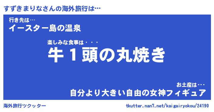 すずきまりなさんの海外旅行は… 楽しみな食事は・・・『牛1頭の丸焼き』行き先は…『イースター島の温泉』お土産は・・・『自分より大きい自由の女神フィギュア』 ツクッター #海外旅行ツクッター http://tkutter.nan7.net/kaigairyokou/24190/