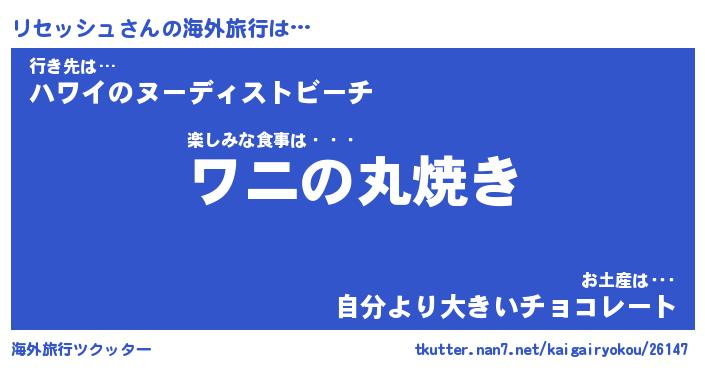 リセッシュさんの海外旅行は… 楽しみな食事は・・・『ワニの丸焼き』行き先は…『ハワイのヌーディストビーチ』お土産は・・・『自分より大きいチョコレート』 ツクッター #海外旅行ツクッター http://tkutter.nan7.net/kaigairyokou/26147/