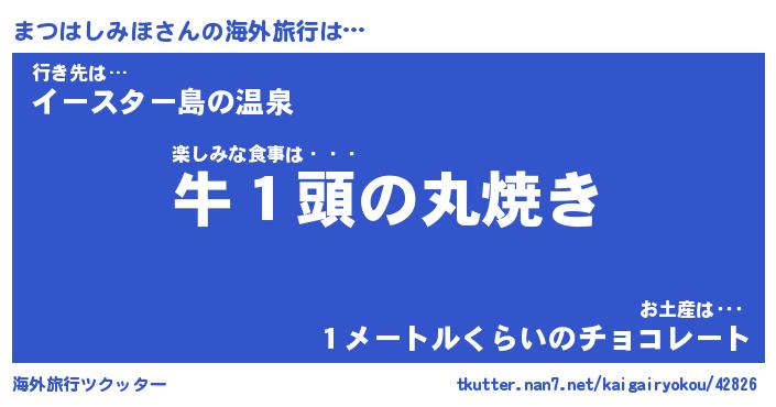 まつはしみほさんの海外旅行は… 楽しみな食事は・・・『牛1頭の丸焼き』行き先は…『イースター島の温泉』お土産は・・・『1メートルくらいのチョコレート』 ツクッター #海外旅行ツクッター http://tkutter.nan7.net/kaigairyokou/42826/