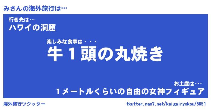 みさんの海外旅行は… 楽しみな食事は・・・『牛1頭の丸焼き』行き先は…『ハワイの洞窟』お土産は・・・『1メートルくらいの自由の女神フィギュア』 ツクッター #海外旅行ツクッター http://tkutter.nan7.net/kaigairyokou/5851/