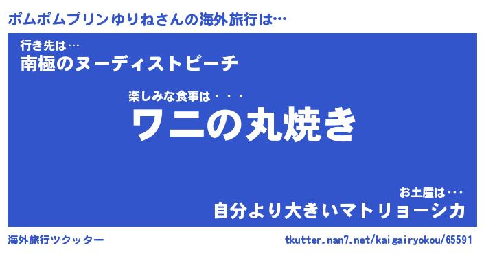 ポムポムプリンゆりねさんの海外旅行は… 楽しみな食事は・・・『ワニの丸焼き』行き先は…『南極のヌーディストビーチ』お土産は・・・『自分より大きいマトリョーシカ』 ツクッター #海外旅行ツクッター http://tkutter.nan7.net/kaigairyokou/65591/