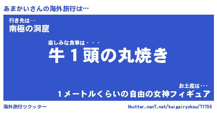 あまかいさんの海外旅行は… 楽しみな食事は・・・『牛1頭の丸焼き』行き先は…『南極の洞窟』お土産は・・・『1メートルくらいの自由の女神フィギュア』 ツクッター #海外旅行ツクッター http://tkutter.nan7.net/kaigairyokou/71759/