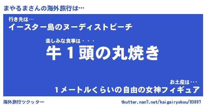 まやるまさんの海外旅行は… 楽しみな食事は・・・『牛1頭の丸焼き』行き先は…『イースター島のヌーディストビーチ』お土産は・・・『1メートルくらいの自由の女神フィギュア』 ツクッター #海外旅行ツクッター http://tkutter.nan7.net/kaigairyokou/83897/