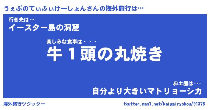 うぇぶのてぃふぃけーしょんさんの海外旅行は… 楽しみな食事は・・・『牛1頭の丸焼き』行き先は…『イースター島の洞窟』お土産は・・・『自分より大きいマトリョーシカ』 ツクッター #海外旅行ツクッター http://tkutter.nan7.net/kaigairyokou/91376/