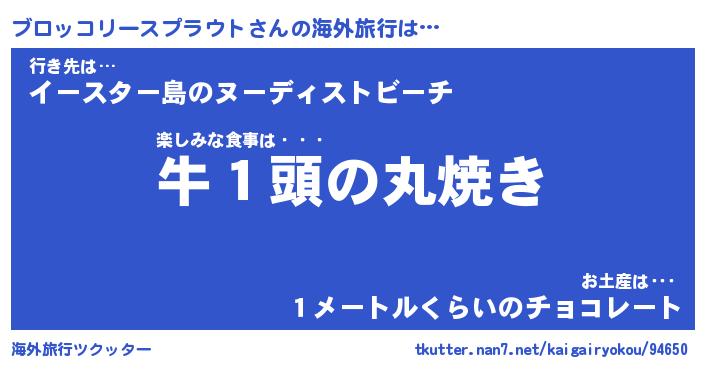 ブロッコリースプラウトさんの海外旅行は… 楽しみな食事は・・・『牛1頭の丸焼き』行き先は…『イースター島のヌーディストビーチ』お土産は・・・『1メートルくらいのチョコレート』 ツクッター #海外旅行ツクッター http://tkutter.nan7.net/kaigairyokou/94650/