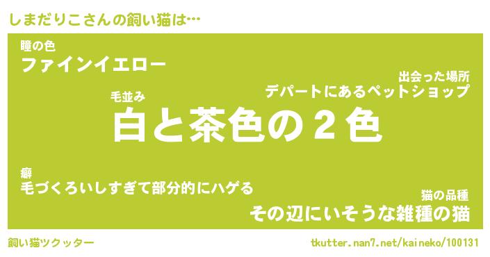 しまだりこさんの飼い猫は… 毛並み『白と茶色の2色』瞳の色『ファインイエロー』猫の品種『その辺にいそうな雑種の猫』 ツクッター #飼い猫ツクッター http://tkutter.nan7.net/kaineko/100131/