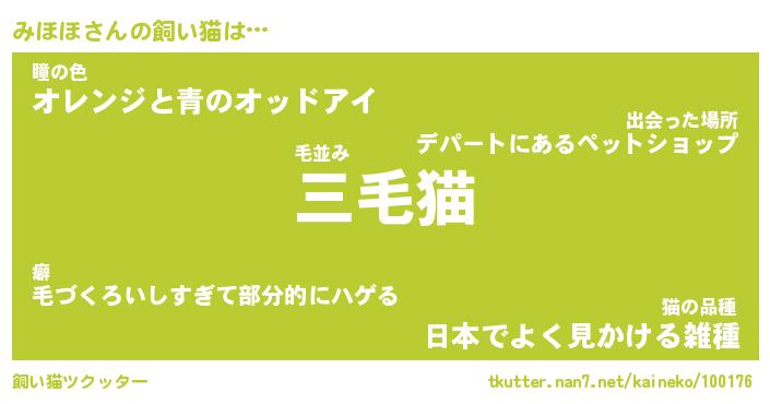 みほほさんの飼い猫は… 毛並み『三毛猫』瞳の色『オレンジと青のオッドアイ』猫の品種『日本でよく見かける雑種』 ツクッター #飼い猫ツクッター http://tkutter.nan7.net/kaineko/100176/